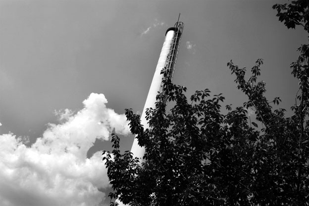 煙突は四角い形状をしています。施設の背景、雲に覆われているのが古くから