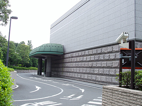 北側にある専用駐輪場から見た地下駐車場への進入路と式場棟の壁面です。